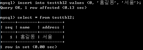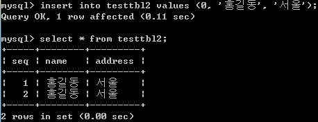 mysql> insert into testtbl2 values (0, '홍길동', '서울');