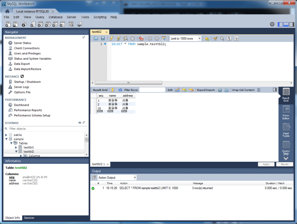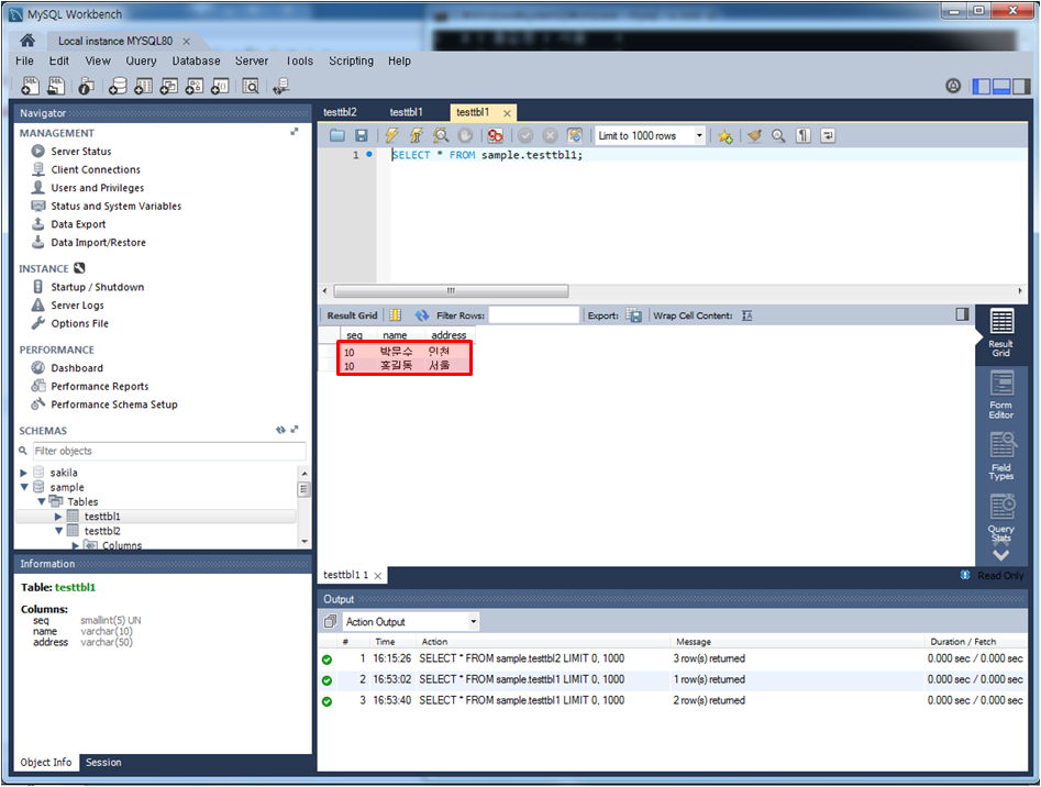 mysql> insert into testtbl1 values (10, '홍길동', '서울');