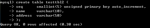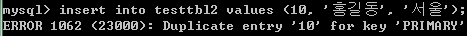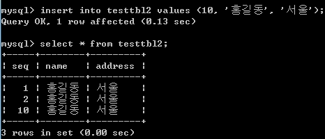 mysql> insert into testtbl2 values (10, '홍길동', '서울');