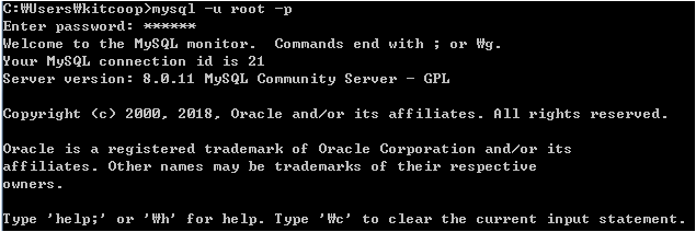 C:\Users\kitcoop>mysql -u root -p Enter password: ******