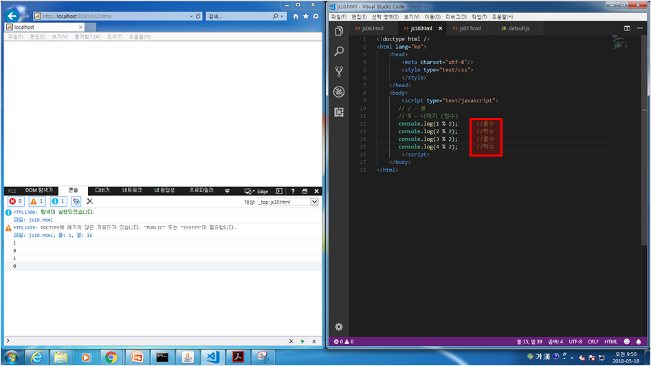 js.10 연산자 %를 이용한 짝, 홀수; 배수