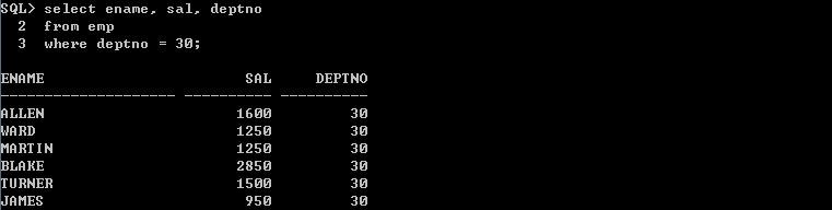ex) 30번의 부서의 사원번호, 사원명, 직책을 출력하는 사원명을 오름차순으로 출력하시오