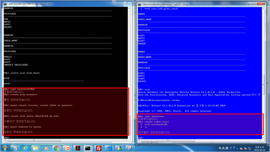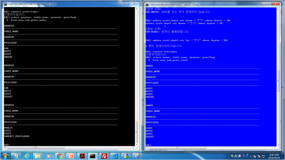 좌측(Scott-grantor, owner), 우측(Tom-grantee)의 권한 조회