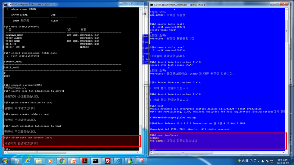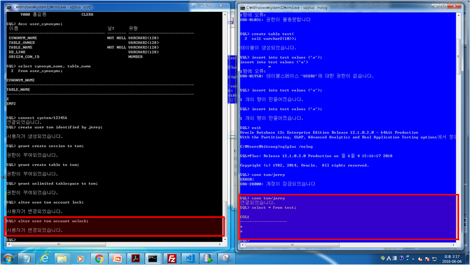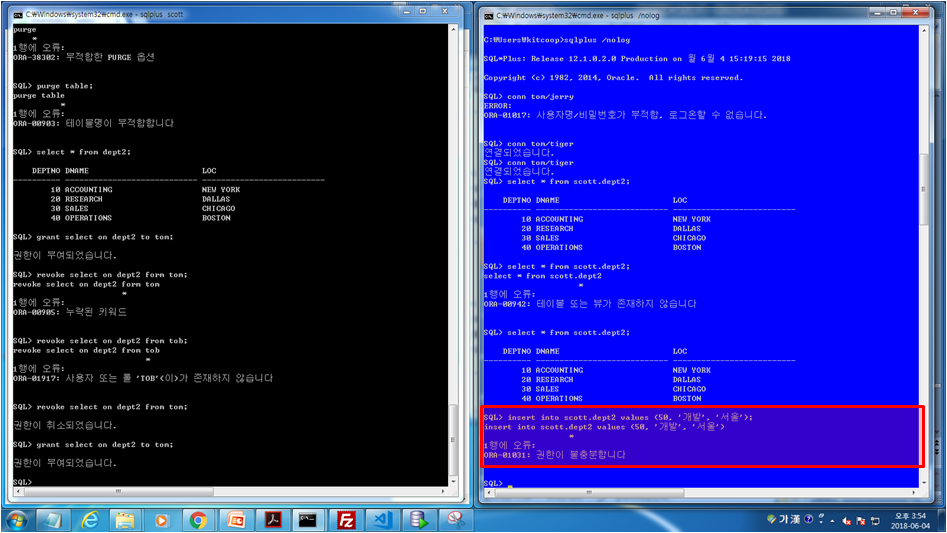 좌측(Scott)에서 Revoke(권한 회수) 하여 우측(Tom)에서 열람 불가능