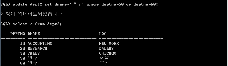 1. 부서 테이블에 부서코드가 99, 부서명은 '관리과', 위치는 '대구'인 행을 입력하시오