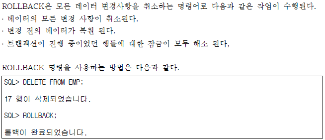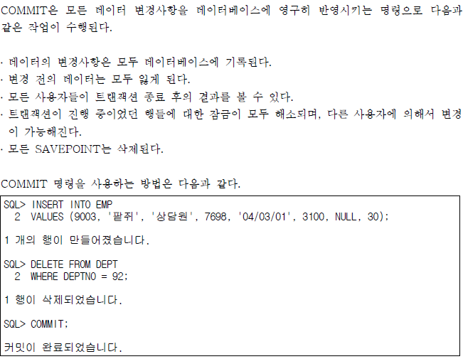 commit; (All) - 부분 Commit이란 개념 없다. 전부다 commit되던가 전부다 취소되던가 한다.