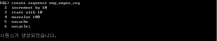 1. 초기값 1, 중분 1, 최소값 1, 최대값 9999인 TEST_SEQ를 생성하시오. 단, 시퀀스 번호는 순환되지 않으며, 시퀀스 번호 추출시 한번에 10개씩 메모리에 캐시하도록 한다