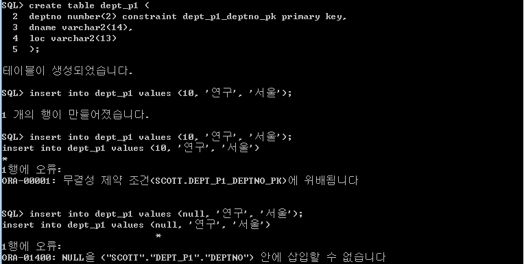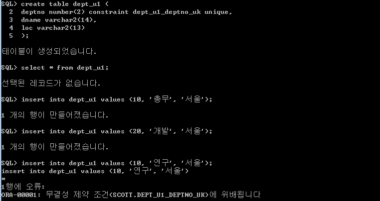 deptno가 unique라 그외 dname, loc은 중복입력이 되지만 unique는 중복이 되지 않아 에러가 난다