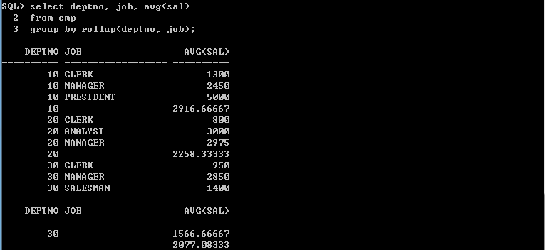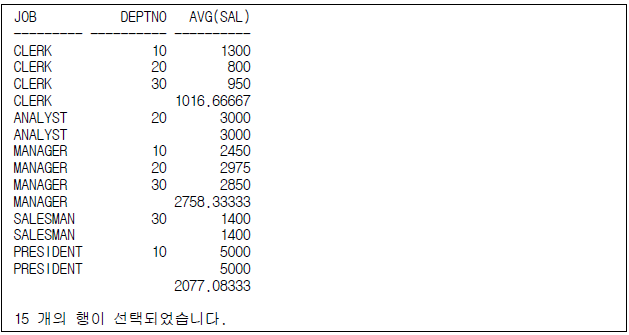 5. 사원 테이블에서 업무 및 부서코드별 평균 급여, 업무별 평균 급여, 전체 평균 급여를 출력하는 SQL 문장을 작성하시오