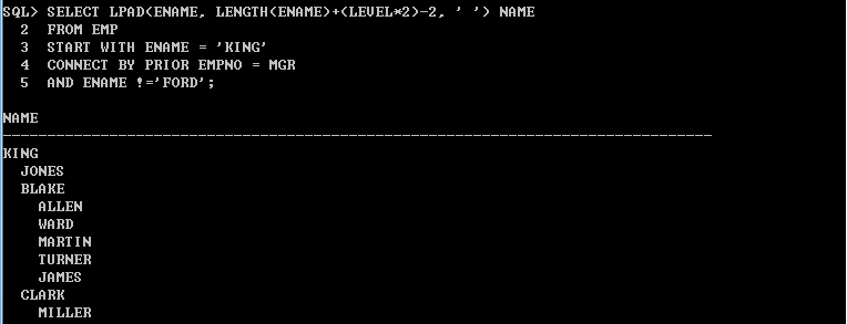3. 계층형 쿼리를 이용하여 'KING'의 부하직원을 출력하시오. 단, 'BLAKE'와 'BLAKE'의 부하직원들은 제외 할 것
