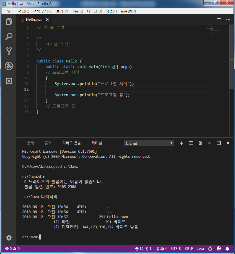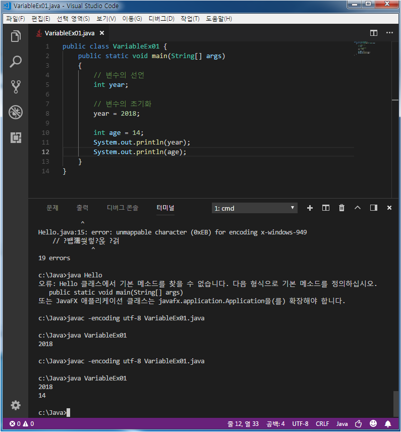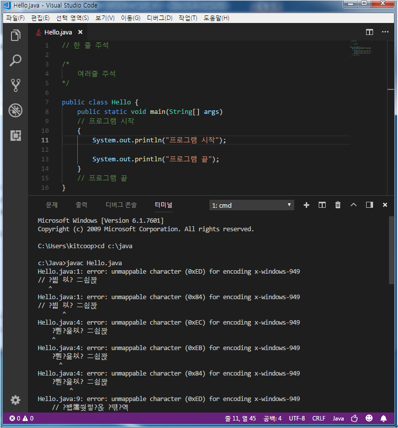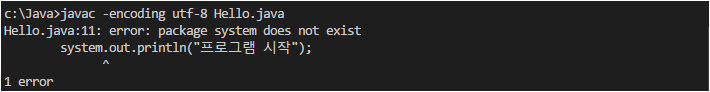 javac -encoding utf-8 파일명.java (한글이 들어가면 -encoding utf-8을 넣어준다)