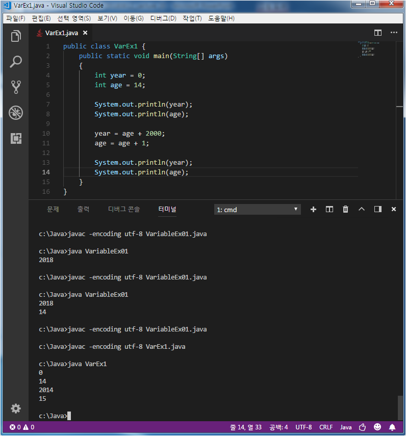 int age = 14; 변수 선언과 초기화를 동시에 함