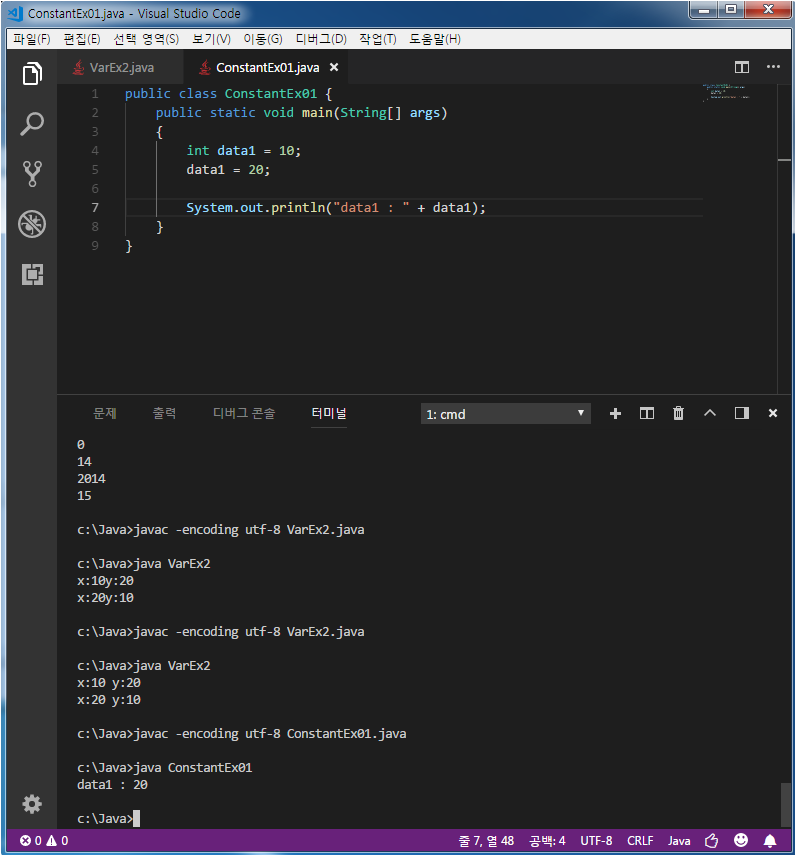 상수를 선언하는 방법은 변수와 동일하며, 단지 변수의 타입 앞에 키워드 'final'을 붙여주기만 하면 된다.
