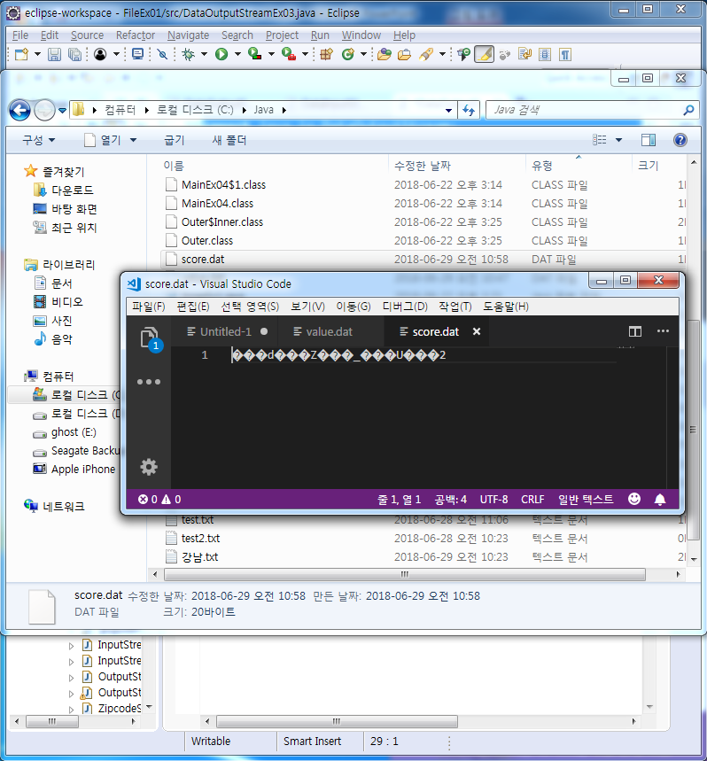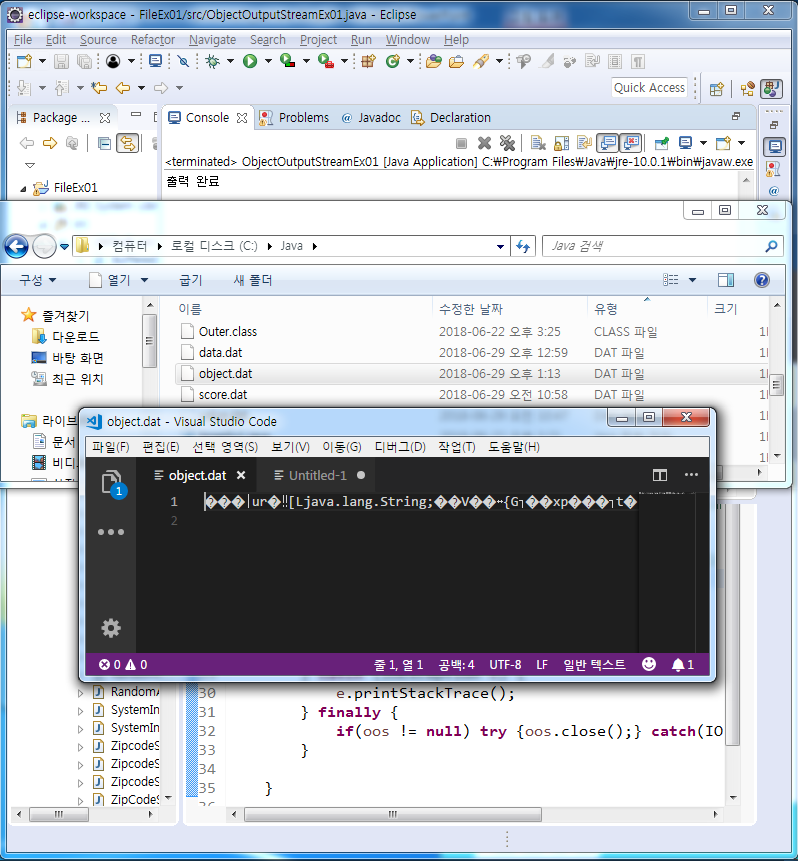 출력한 값들은 이진 데이터(binary data)로 저장 된다. 문자 데이터(text data)가 아니므로 문서 편집기로 열어봐도 알 수 없는 글자들로 이루어져 있다. 파일을 16진수 코드로 볼 수 있는 UltraEdit과 같은 프로그램이나 ByteArrayOutputStream을 사용하면 이진데이터를 확인할 수 있다