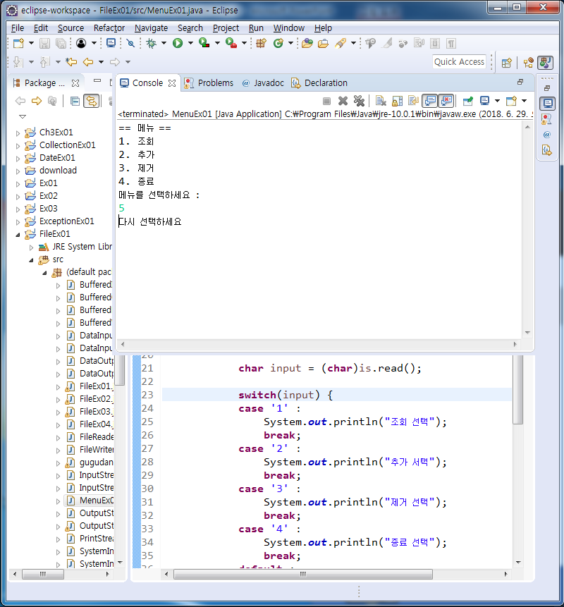 표준입출력은 콘솔(console, 도스창)을 통한 데이터 입력과 콘솔로의 데이터 출력을 의미한다. 자바에서는 표준 입출력(standard I/O)을 위해 3가지 입출력 스트림, System.in, System.out, System.err을 제공하는데, 이 들은 자바 어플리케이션의 실행과 동시에 사용할 수 있게 자동적으로 생성되기 때문에 개발자가 별도로 스트림을 생성하는 코드를 작성하지 않고도 사용이 가능하다.