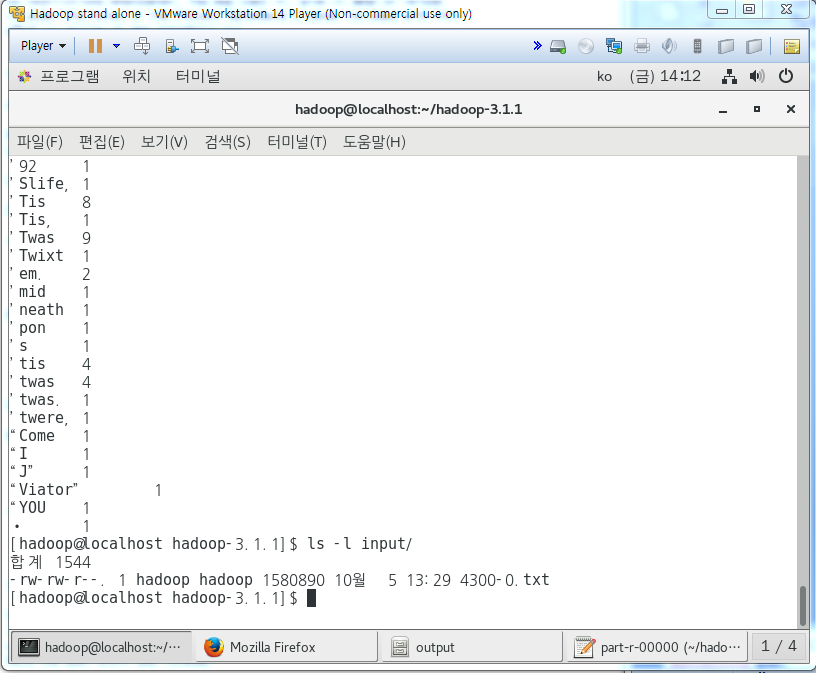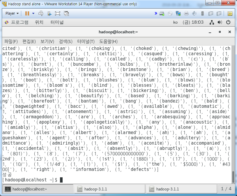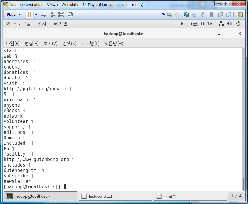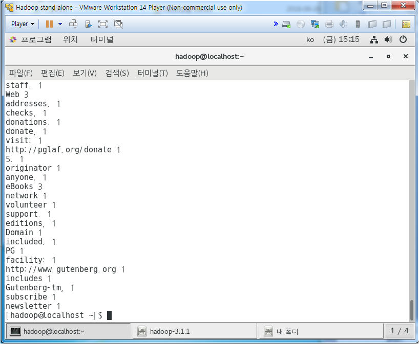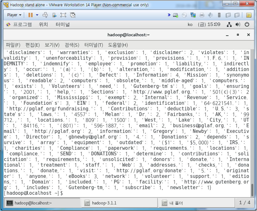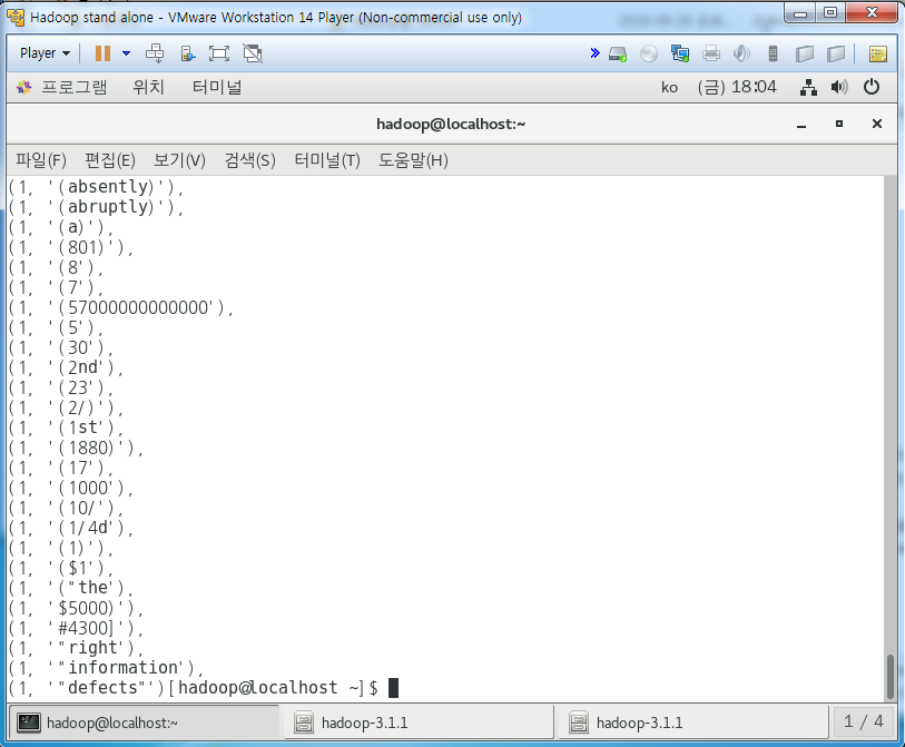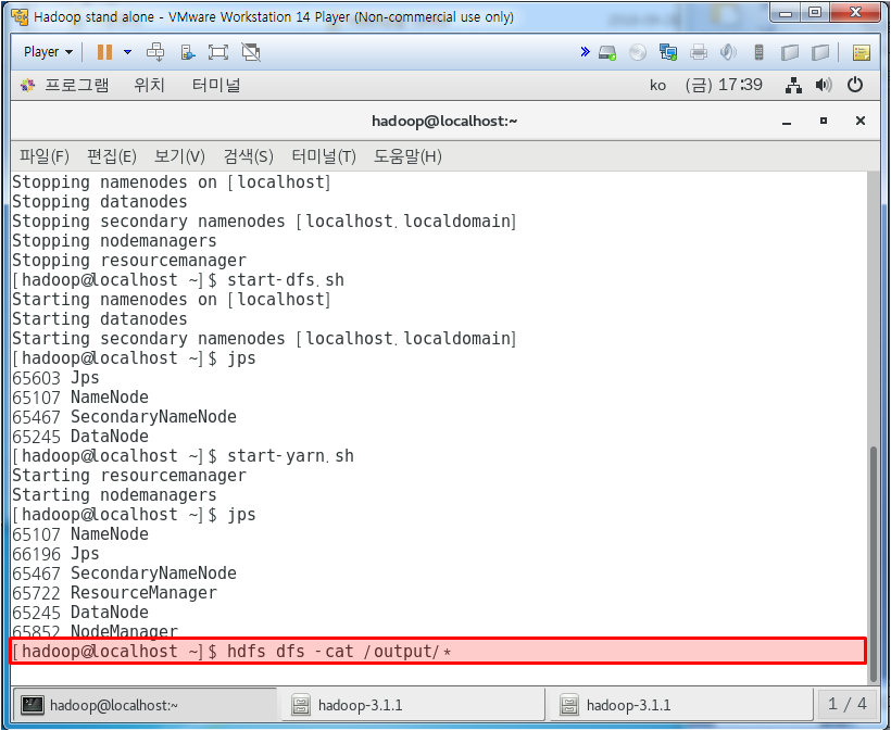 [hadoop@localhost hadoop-3.1.1]$ hadoop jar share/hadoop/mapreduce/hadoop-mapreduce-examples-3.1.1.jar wordcount input/* output