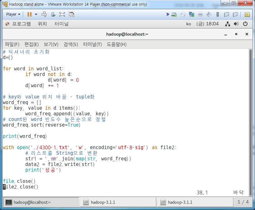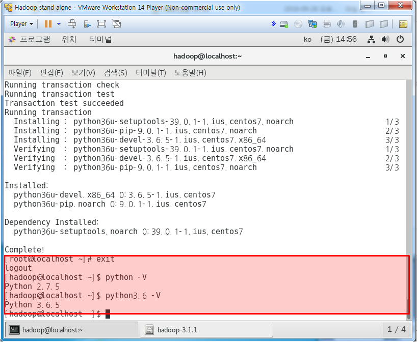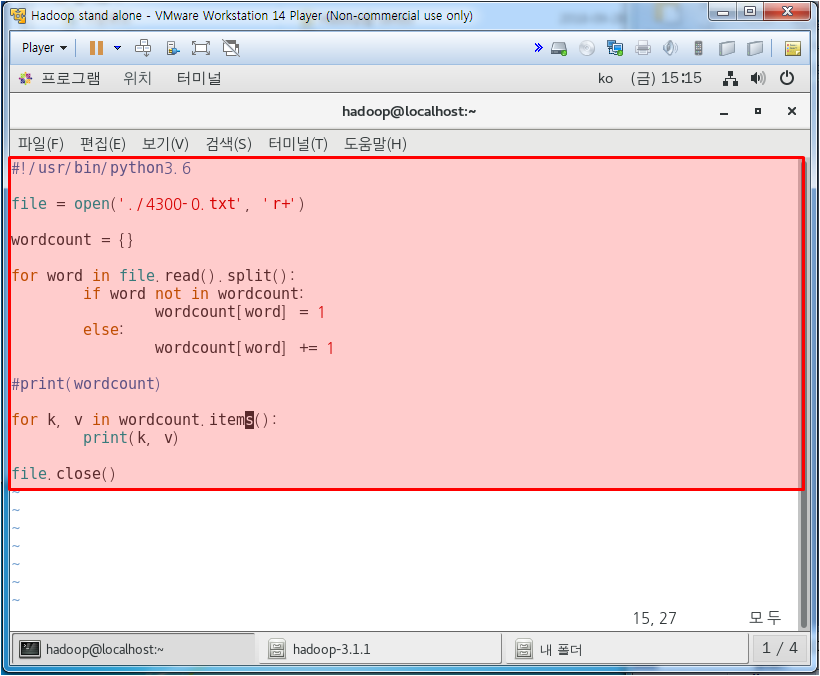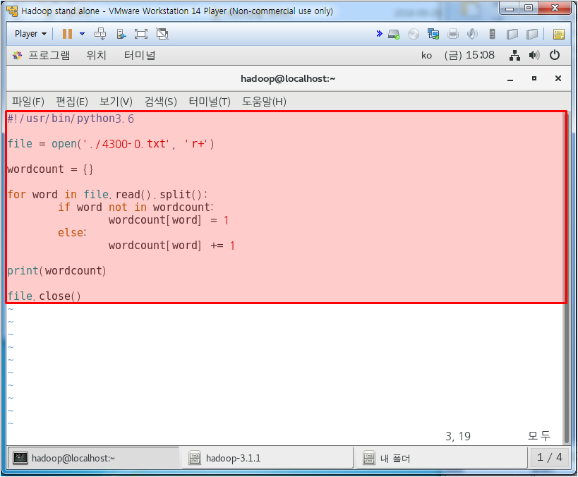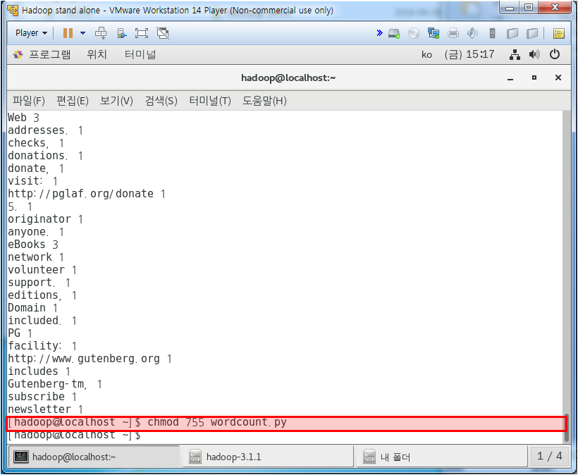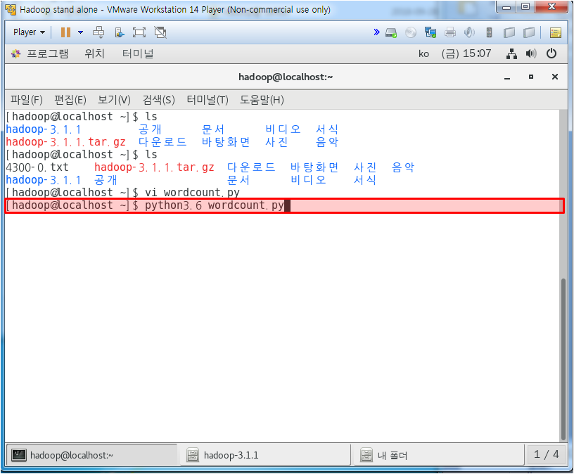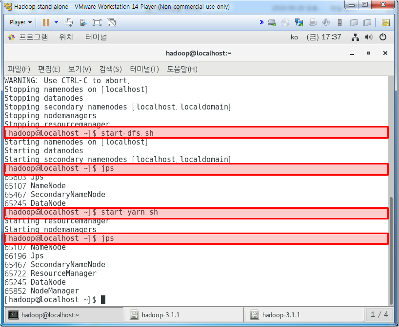 [hadoop@localhost hadoop-3.1.1]$ hadoop jar share/hadoop/mapreduce/hadoop-mapreduce-examples-3.1.1.jar wordcount input/* output